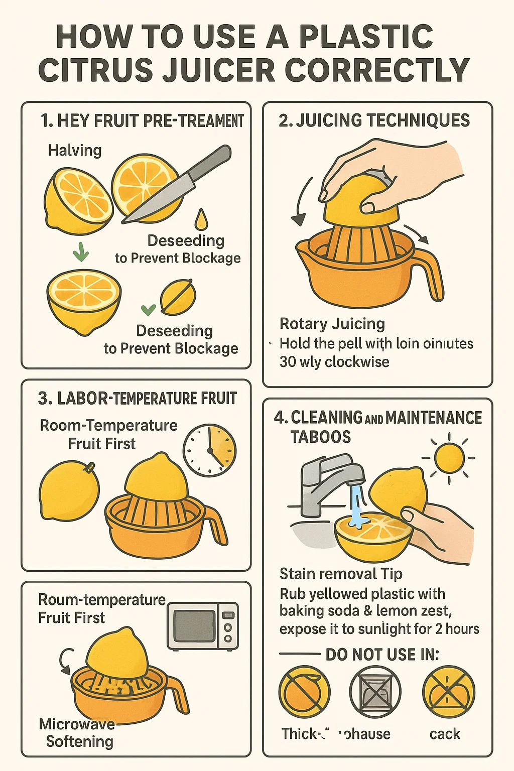 Enjuague inmediatamente para evitar manchas: Enjuague inmediatamente con agua fría después de exprimir (el agua caliente acelera la penetración del aceite de fruta en el plástico, provocando que se ponga amarillo).