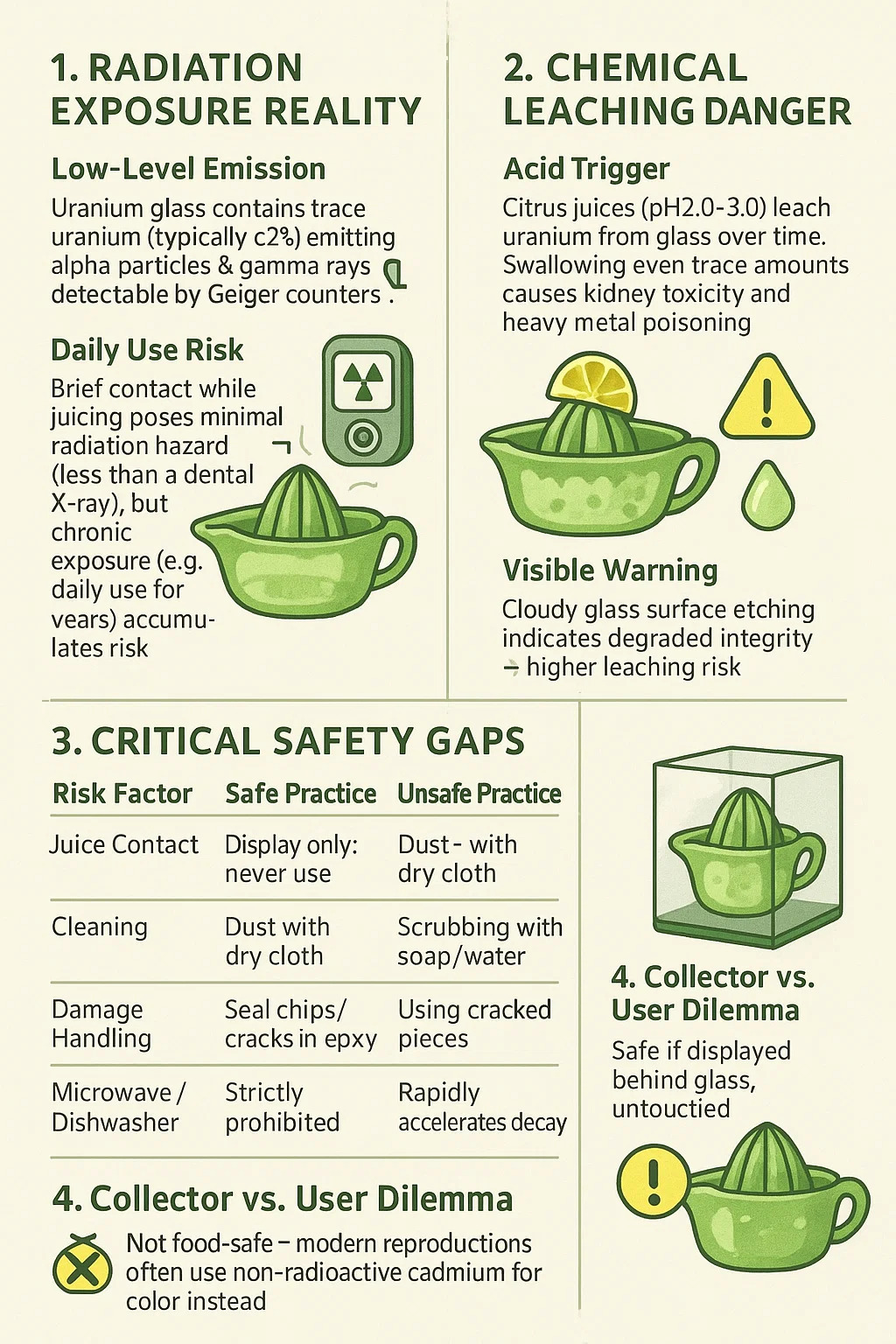 Desencadenante ácido: Los jugos cítricos (pH 2,0–3,0) lixivian uranio del vidrio con el tiempo. La ingestión de incluso pequeñas cantidades provoca toxicidad renal e intoxicación por metales pesados.